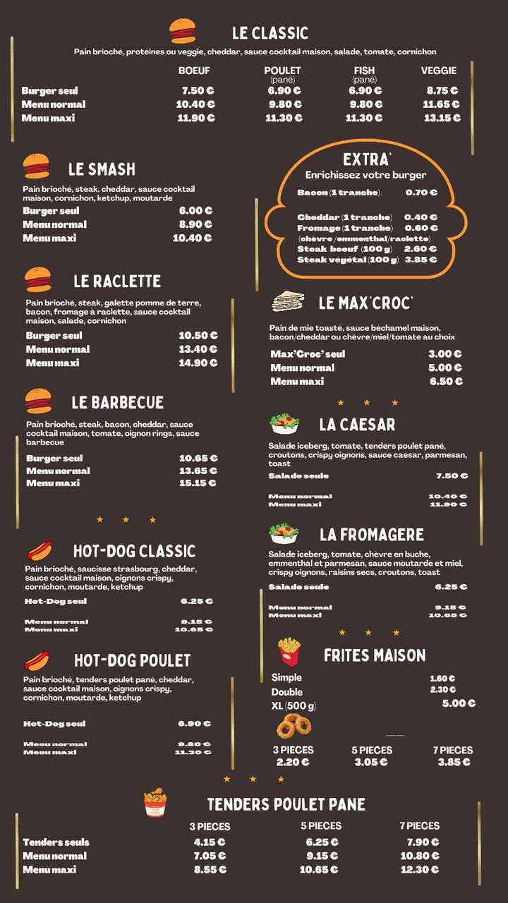 Découvrez nos burgers généreux, hot-dogs savoureux, salades et frites maison, notre sélection de desserts : donuts, cookies et bien plus encore.